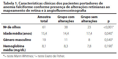 Foram estudados 61 olhos de 31pacientes (em um dos pacientes, um olho não pode ser avaliado por apresentar catarata traumática) portadores de anemia falciforme, dos quais 19 (61,3%) eram do sexo masculino. A média de idade da amostra foi de 15,4 ± 5,3 anos (14,4 anos nos pacientes com retinopatia x 17,4 anos nos sem alterações, p=0,04). A hemoglobina basal média dos pacientes do estudo foi de 8,1 ± 1,2 mg/dL (8,3 mg/dL no grupo dos com retinopatia e 7,8 mg/dL no sem alterações, p=0,19). Considerando-se em conjunto os resultados do mapeamento de retina e da angiofluoresceinografia, observou-se 38 olhos (19 pacientes) com retinopatia falciforme (62,3%) e 23 (12 pacientes) sem alterações (p<0,001), conforme consta na tabela1.