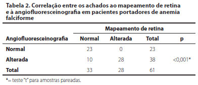 Ao mapeamento de retina encontraram-se 33 olhos normais e 28 com alterações do tipo não proliferativas. Na angiofluoresceinografia foram vistos 23 olhos normais, 17 com tortuosidades vasculares e 5 com oclusões arteriolares na retina periférica (estágio I de Goldberg), 15 com anastomoses arteriovenosas na periferia da retina (estágio II) e 1 com proliferações neovasculares (estágio III). Ao mapeamento de retina, 14 pacientes apresentaram retinopatia bilateral relacionada à doença falciforme.