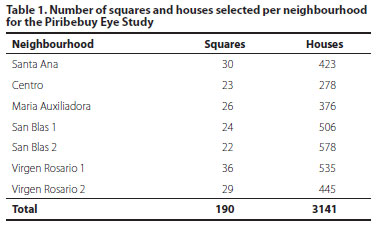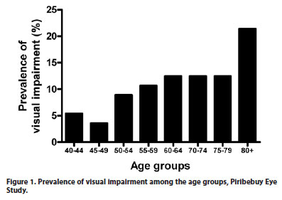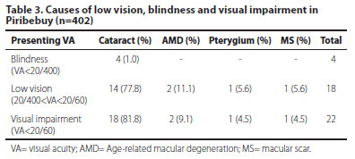 METHODS: A population based study was conducted from September to November 2007 in Piribebuy, Paraguay. Based on the city map, seven clusters were randomly selected, containing 22 to 36 squares (423 to 578 houses) each, where all subjects > 40 years old who agreed to participate were included in the study. Presenting vision acuity (VA) was obtained for each eye, with 'E' Snellen charts 6 meters far from the patient with appropriate light. Eyes with VA<20/60 were also tested with the pinhole. Objective and subjective refraction was performed, followed by examination of anterior segment under the slit-lamp, Goldmann applanation tonometry, and pupil dilatation with 0.5% tropicamide plus 0.5% phenylephrine, followed by evaluation of the posterior pole. Best corrected visual acuity was used to classify the patients as follows: blindness was defined as visual acuity of the better eye <20/400, low vision as 20/400 <VA <20/60 and visual impairment as VA <20/60. Similar to the methodology followed by the Rapid Assessment of Avoidable Blindness studies, in patients presenting more than one eye disease equally contributing to visual loss, only the most treatable or avoidable cause was recorded.