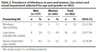 RESULTADOS: 402 indivíduos foram submetidos à avaliação oftalmológica (92% da amostra original). A prevalência de cegueira e baixa visão ajustada para sexo e idade foi 1,0% (95% IC: 0,3-2,7) e 4,5% (95% IC: 2,8-7,1), respectivamente. Catarata foi a única causa de cegueira e a maior causa de baixa visão (77.8% dos casos), seguido por degeneração macular relacionada à idade (11,1%), pterígio (5,6%) e cicatriz macular bilateral (5,6%).