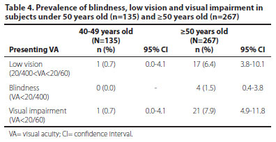 PURPOSE: To determine the prevalence and causes of blindness in Piribebuy, Paraguay. METHODS: A population based study was conducted from September to November 2007 in Piribebuy, Paraguay. Based on the city map, seven clusters were randomly selected, containing 22 to 36 squares (423 to 578 houses) each, where all subjects > 40 years old who agreed to participate were included in the study. Presenting vision acuity (VA) was obtained for each eye, with 'E' Snellen charts 6 meters far from the patient with appropriate light. Eyes with VA<20/60 were also tested with the pinhole. Objective and subjective refraction was performed, followed by examination of anterior segment under the slit-lamp, Goldmann applanation tonometry, and pupil dilatation with 0.5% tropicamide plus 0.5% phenylephrine, followed by evaluation of the posterior pole. Best corrected visual acuity was used to classify the patients as follows: blindness was defined as visual acuity of the better eye <20/400, low vision as 20/400