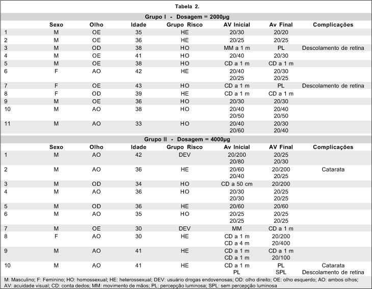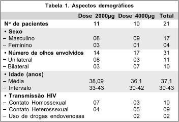 Dos 1950 pacientes examinados, 21 (1,07%) apresentaram diagnóstico de retinite por CMV e intolerância à medicação sistêmica (ganciclovir ou foscarnet). Foram submetidos à injeção intravítrea de ganciclovir, 31 olhos de 21 pacientes. Onze pacientes (14 olhos) foram tratados com dosagem de 2000 µg e 10 pacientes (17 olhos) com dosagem de 4000 µg conforme tabela 2.