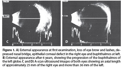 Ectodermal dysplasia (ED) is a congenital syndrome characterized in general terms by sparse hair, severe oligodontia, missing or scanty eye brows, lashes and reduced sweating. It is considered a large and complex group of genetic disorders defined by the abnormal development of two or more structures of the ectodermal layer. Nearly 200 different conditions have been described as ED, however, to the best of our knowledge, no previous association with glaucoma or uncontrollable eye growth has been reported(6,7).