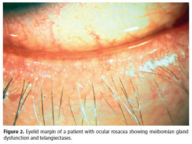 Blepharitis and meibomian gland dysfunction are common findings(3,15). Slit-lamp examination of the eyelid margins reveals telangiectases (Figure 2), dilated meibomian glands, excessive seborrheic secretion and collarettes around the eyelashes(15). Excessive meibomian secretion may lead to a soapy aspect of the inferior tear meniscus. Debris in the tear film may also be present. Recurrent hordeolum/chalazion and tear film insufficiency are commonly observed as a consequence of meibomian gland dysfunction(9,15). Dry eyes, with abnormal Schirmer test, were reported in 56-62.5% of patients with ocular rosacea(24,51,63). Diminished tear break-up time (TBUT) has also been reported in a large majority of patients with ocular rosacea(24,51,60).