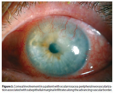 Recurrent corneal epithelial erosions have been reported in patients with ocular rosacea(67,74,75). Other uncommon corneal findings include pseudodendritic ulcer and pseudokeratoconus, presenting with inferior corneal thinning and high astigmatism(76-78). Secondary infectious keratitis has been reported(79,80).