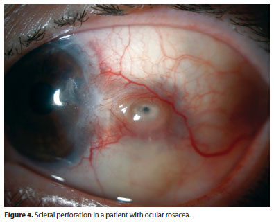 Other ocular findings include iritis, episcleritis and scleritis(5,15). We have previously published a case of spontaneous scleral perforation in a patient with rosacea (Figure 4)(81).