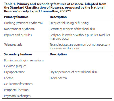 To aid in diagnosis, in 2002, an expert committee of the American National Rosacea Society published a standard classification system for rosacea(54). As well as serving as a diagnostic tool, this classification facilitates communication among dermatologists, researchers and other specialists(54,55). This important publication describes primary and secondary features of rosacea and defines 4 subtypes (erythematotelangiectatic, papulopustular, phymatous and ocular rosacea) and 1 variant (granulomatous rosacea) of the disease(54). The primary and secondary features are listed in table 1. The presence of one or more of the primary signs with an axial facial distribution is indicative of rosacea. One or more of the secondary features may or may not be present.