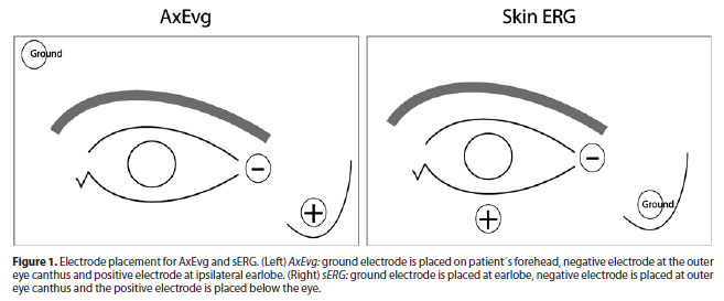Interestingly, the difference between electrode placement for AxEvg and sERG is that the electrode placed closest to the eye is the negative pole, which might explain the waveform configuration found in AxEvg recordings. Figure 1 shows electrode placements for AxEvg and sERG.