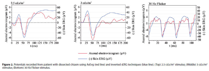 In this work, authors recorded electrophysiological potentials using the Axonal electrovisiogram (AxEvg) paradigm, which is a method developed by Sabadel et al.(2), to record pre-chiasmatic electric potentials, in normal subjects.