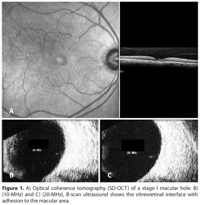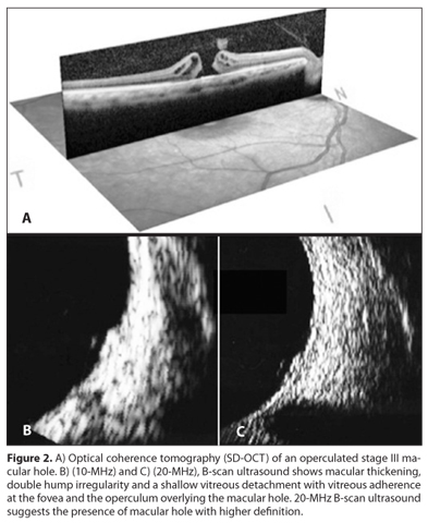 The advent of spectral domain optical coherence tomography (SD-OCT) has provided new insight into the vitreoretinal interface and readily identifies the presence of macular holes (MH) and other vitreomacular diseases(2,3). OCT can be viewed as an optical analog of ultrasound. However, as this technique relies on light energy it can be used only when media (cornea, lens, vitreous) are optically clear. It is also limited to the central fundus (i.e. , images are acquired through the pupil), and provides limited depth of penetration (about 1 mm)(1). In cases of media opacity (dense cataract, leukoma, vitreous hemorrhage), the US exam may predict some macular features and provide further assistance for surgery as well as prognosis(1).
