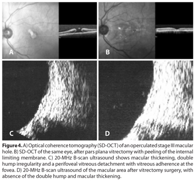 The advent of OCT provided unprecedented visualization of the vitreomacular interface, which has led to a better comprehension of MH formation(3). This cross-sectional imaging technology has allowed investigators to study, in a non-invasive manner, the disease processes that were previously unrecognizable by biomicroscopy alone. Vitreomacular adhesion plays a larger role in retinal disease than was previously understood(7). OCT is still the gold standard for the diagnosis of macular diseases, unless in cases of opaque media when images cannot be acquired, or when OCT devices are not available. In these conditions, the combined ultrasonographic study using 10 and 20-MHz can provide a valid evaluation of the vitreoretinal interface(8).