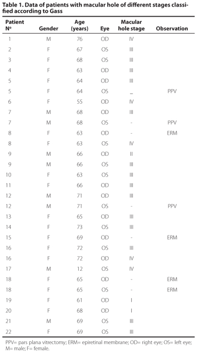 Twenty-nine eyes of 22 patients with biomicroscopy evidence of MH at different stages were included in the study from May to October 2009 (6 months). Patients were evaluated with slit lamp and 75 D fundus contact lens to a clinical diagnosis of evolving or full-thickness idiopathic MH. Gass classification of MH was used(5,6).