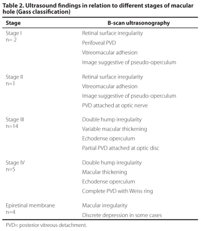 Considering MH stage III, the ultrasonographic findings were variable macular thickening, double hump irregularity, with or without images consistent with prefoveal pseudo-operculum (small echodense opacity suspended anterior to the foveolar area) and attached to a thinner echodense linear opacity that appeared to connect to the prepapillary glial tissue nasally, suggesting the diagnosis of a partial PVD.