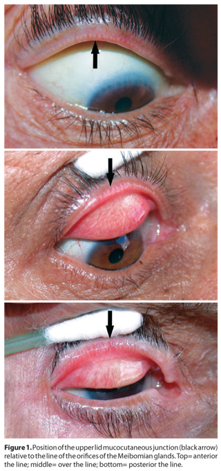 Two experienced ophthalmologists with oculoplastic training performed a comprehensive biomicroscopic analysis of the upper lid margin and ocular surface in all subjects. The lid mucocutaneous junction was identified and its position graded with respect to the line of meibomian gland orifices into 3 categories: a) anterior, b) at the line, and c) posterior to the line (Figure 1). Ocular surface dye staining with lissamine green (LG) was then performed. One drop of LG was instilled on the inferior fornix without any previous anesthetic drops. Any staining area on the nasal or temporal bulbar conjunctiva was recorded as positive. Conjunctival areas with any abnormalities such as pterygium or pingueculas were excluded.