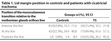 OBJETIVOS: Avaliar a posição da margem palpebral superior e a superfície ocular no tracoma cicatricial sem triquíase (TS). MÉTODOS: A localização da transição mucocutânea da pálpebra superior foi avaliada com lâmpada de fenda em 156 olhos de 78 pacientes com triquíase e de 130 olhos de 65 controles. A posição da transição mucocutânea foi classificada em relação à linha das glândulas de Meibômio em três categorias: a) anterior, b) sobre a linha e c) posterior a linha. A superfície ocular de todos os olhos foi avaliada com verde de lissamina. Todos os participantes responderam ao questionário sobre a presença e intensidade dos sintomas relacionados ao olho seco. RESULTADOS: Nos olhos com triquíase a localização da transição mucocutânea foi posterior à linha das glândulas de Meibômio em 55 (35,3%), sobre a linha em 77 (49,4%) e anterior à linha em somente 24 (15,4%). No grupo controle essa distribuição foi 5 (3,8%); 42 (42%) e 83 (63,8%). A positividade ao corante de lissamina e sintomas de olho seco também foram associados à triquíase. CONCLUSÃO: Diferentes graus de entrópio de pálpebra superior estão presentes no tracoma cicatricial mesmo na ausência de triquíase. Triquíase está associada à positividade ao corante verde lissamine e sintomas de olho seco. A conjuntivalização da margem palpebral pode ser um fator no desenvolvimento do olho seco tracomatoso.