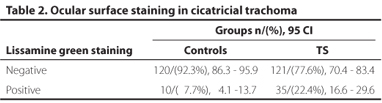 Lissamine staining (Table 2) was positive in 22.4% of the eyes with TS and in 7.7% of the controls. The association between lissamine staining and TS was also highly significantly (p=0.0006; odds ratio = 3.47, (95 % CI 1.64 - 7.33).