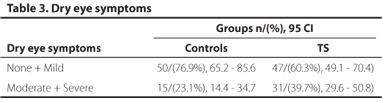 Only two subjects with TS and one control had severe dry eye symptoms (Table 3). When the symptoms were grouped (none + mild versus moderate + severe) the association between dry eye complaints and TS was just significant (p=0.05; odds ratio = 1.05 - 4.58).
