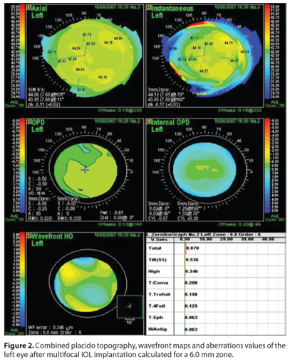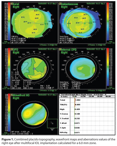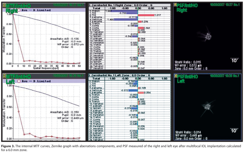 Wavefront analysis was performed 6 months postoperatively with OPD-scan (Nidek Co. , Ltd. , Gamagori, Japan). Total-eye wavefront analysis revealed moderate negative spherical aberration in both eyes with RMS values of 0.036 and 0.063 in the right and left eye, respectively. Postoperative wavefront maps with Zernike modes and aberrations values are shown in figures 1 and 2. Figure 3 shows modulation transfer function (MTF) measurements of both eyes with similar performance levels to each other.