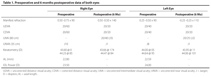 The patient did not report visual discomfort and was satisfied with the amount of improvement in her vision in both eyes. Despite a myopic shift was expected due to the anterior effective lens position this seemed not to worsen postoperative refraction and UCVA in this case. Three and a half years later, the UCVA dropped from 20/20 to 20/40 in the left eye as a result of posterior capsule opacification and an Nd:YAG posterior capsulotomy was performed without complications.