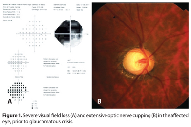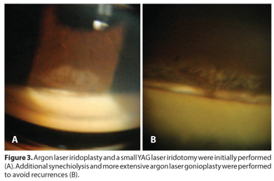 As far as we can tell, it is very appropriate to complement the goniopuncture with an extensive argon laser gonioplasty, especially in high risk cases as ours (severe glaucoma, only functional eye), since iris prolapse and synechia following the procedure, although uncommon, are potentially sight threating conditions. After goniopuncture and even in wide angles, the pupil dilation should be followed by a careful gonioscopy to study how the iris behaves in such situations, and if necessary, complementary pilocarpine drops or laser procedures should be performed to avoid glaucomatous crisis. These additional procedures should be evaluated further in future studies.