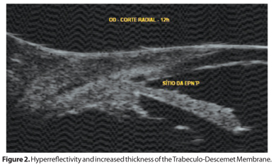 On the 5th postoperative month, the filtering bleb was slightly lower and IOP rose to 19 mmHg. UBM findings showed a hyper-reflectivity and increased thickness of the TDM (Figure 2), due to pigment deposition at the filtration site. Nd:YAG goniopuncture using free-running Q-switched mode with energy of 2.2 mJ was performed at TDM, until filtration was noted. IOP went down to 7 mmHg immediately after the procedure and then decreased further to 2 mmHg with the formation of a large and diffuse bleb. By the second month, IOP rose again to 8 mmHg. The patient was followed every other month for IOP control, which ranged from 6 to 8 mmHg for about a year, with the presence of a diffuse and healthy filtering bleb. She also underwent argon laser retinal photocoagulation for a peripheral hole, and no signs of ocular hypotony or iris synechia on gonioscopy were noted during that period of time.