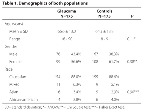 This was a retrospective, comparative study approved by the Ethics Committee/Investigational Review Board of the University of Campinas, Brazil. The charts of 175 consecutive glaucoma patients and 175 age-matched (+2 years) controls followed at two private offices (VPC and RA) were reviewed. Both Institutions followed patients with glaucoma and patients without glaucoma.