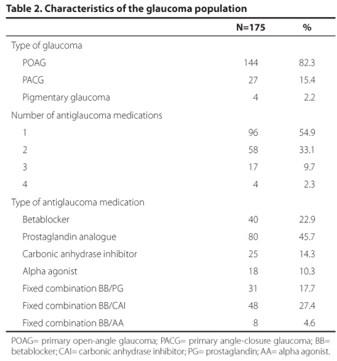 Table 1 lists the demographics of both populations. There were no significant differences regarding mean age, distribution of gender, or race between the groups (p>0.05). Most of the glaucoma patients had primary open-angle glaucoma (POAG) (82%), and used one antiglaucoma topical medication (55%) (Table 2). Patients in the glaucoma group had been treated for a mean of 4.4 + 4.6 years (range: 1 month to 38 years). Prostaglandin analogues alone (46%) were used more frequently than other antiglaucoma medications. However, betablockers were also used by a large group of patients either alone (23%) or in fixed combinations with other drugs (50%).
