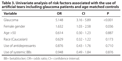 CONCLUSÕES: O tratamento com colírios antiglaucomatosos é um fator de risco para o uso de lágrimas artificiais. Sexo feminino e tratamento a longo prazo com duas ou mais medicações são fatores de risco adicionais para o uso de lágrimas artificiais.