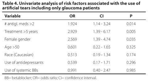 When the glaucoma group was analyzed separately, female gender remained a significant risk factor for the use of artificial tears (OR=2.57), along with the use of 2 or more antiglaucoma medications (OR=1.92) and duration of treatment greater than 5 years (OR=2.92). We could not establish a relationship between type of antiglaucoma medication and the need for artificial tears (Table 4).