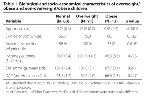 Ninety-six children (40 boys, 56 girls), aged from 6 to 17 years (11.0 ± 2.8), were included in the study. 33 were overweight and obese and biological and socio-economical characteristics of overweight/obese and non-overweight/obese children showed statistical differences (Table 1). Twelve children (12.5%) were obese and 21 (21.8%) overweight; with BMIs of 35.1 ± 5.3 kg/m2 and 26.7 ± 4.1 kg/m2; respectively.