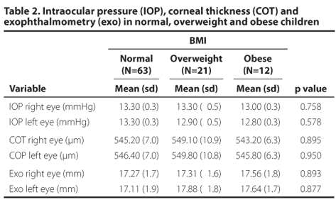 A number of shortcomings of this study should be mentioned. First, the study included a few number of obese children with a high BMI, as Akinci et al. did(7). For this reason it is not possible to carry out a comparative analysis among the obese children. It can be hypothesized that IOP increases only in children with extreme obesity. Another point is that the measurement of IOP was performed by only one ophthalmologist and it was not possible to determine the reliability of the test.