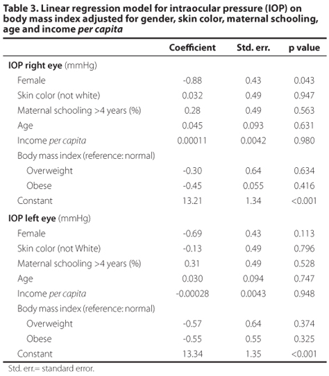 There was no difference in IOP between the overweight/obese and non-overweight/obese children. The mean IOP was 13.5 and 13.0 for the right eye and 13.1 and 12.9 mmHg for the left eye, respectively (p=0.38 and p=0.71). The corneal thickness and exophthalmometry showed no difference among overweight/obese and non-overweight/obese children (Table 2). The coefficient of correlation between BMI and IOP was 0.070 (p=0.496). Multiple linear regression analysis with a significance level of 0.20 did not identify any possible confounding factor in the relation between overweight/obesity and IOP (Table 3).