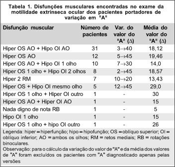 Nesse trabalho a importância das disfunções dos oblíquos nas variações alfabéticas em "A" e "V" foi corroborada, uma vez que 89,74% dos pacientes com "A" e 93% dos pacientes com "V" possuíam disfunções dos músculos oblíquos. Nas anisotropias em "A", a disfunção muscular mais encontrada no exame de motilidade extrínseca ocular foi a hiperfunção de oblíquo superior. Já nas anisotropias em "V", a disfunção de músculo extrínseco ocular mais comum foi a hiperfunção de oblíquo inferior.
