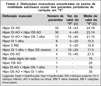 2. Nas anisotropias em "A", a disfunção muscular mais encontrada no exame da motilidade extrínseca ocular foi a hiperfunção de oblíquo superior. Nas anisotropias em "V", a disfunção muscular mais freqüente foi a hiper de oblíquo inferior.