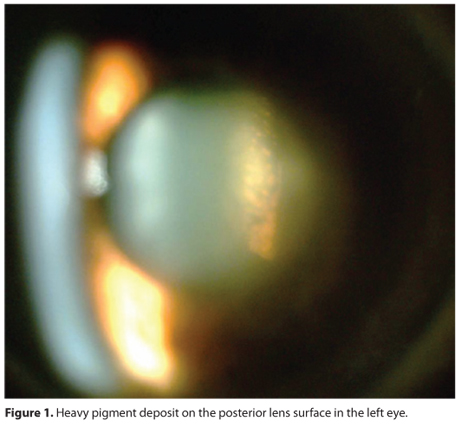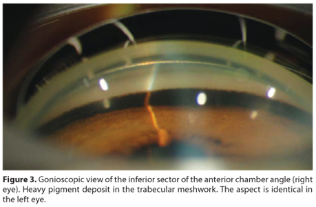 A 61-year-old man presented in July 2011 with acute onset of bilateral and simultaneous ocular pain, red eye, and severe photophobia. Visual acuity was 20/20 OU. Examination revealed 2+ pigmented cells in the anterior chamber and a slight deposition of pigment on the corneal endothelium. IOP was low (6/9 mmHg OD/OS). The initial diagnosis was bilateral anterior uveitis, and the patient was treated using a topical steroid (1% prednisolone every 3 hours) with marked relief of symptoms. However, on the fourth day, while playing "footvolley", his vision suddenly blurred. The next day, slit-lamp evaluation revealed a dense Krukenberg spindle bilaterally. The aqueous humor was turbid with heavy pigment dispersion in the anterior chamber. Pigment granules were deposited on the anterior surface of the iris and posterior lens surface (Figure 1). Transillumination showed extensive bilateral iris defects (Figure 2). IOP was 36/40 mmHg OD/OS. Gonioscopy revealed a wide open angle, a dark trabecular meshwork 360 degrees, and a heavy pigment deposition, particularly in the inferior sector (Figure 3). The vitreous was clear, the fundus was normal, and the optic nerve head cup-disc ratio was 0.1 bilaterally. Over the following days, IOP increased to 48 mmHg in both eyes. The pupil became progressively irregular with small posterior synechiae (Figure 4) and iris transillumination gradually increased. Corneal endothelial cell density was normal (2,877 cells/mm2 OD and 2,984 cells/mm2 OS).