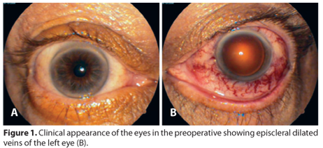 Intraocular pressure is dependent on the rate of aqueous humor production and drainage of the episcleral veins. Increased intraocular pressure and visual field loss due to optical impairment can be the result of the increased pressure of these vessels(6). Possible causes include venous obstructions (venous sinus thrombosis and superior vena cava syndrome), arteriovenous shunts or fistulas, Sturge-Weber syndrome, scleritis, orbital diseases related to thyroidopathy and orbital tumors. Radius-Maumenee syndrome presents as an uncommon entity with a characteristic clinical presentation, and therefore, it should be included among diagnostic possibilities. The finding of episcleral vessel dilation in non-inflamed eyes constitutes a warning to the ophthalmologist of possible glaucoma(4).