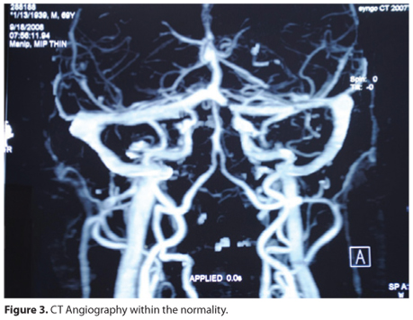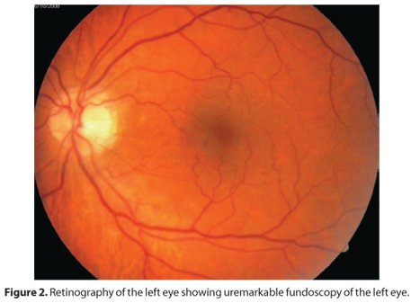 A male patient, aged 69 years old, was admitted to the ophthalmology service with chronic hyperemia of the left eye, which was unresponsive to medical treatment, without other ocular symptoms (Figure 1). He had normal cranial tomography. In his first assessment in 2008, the patient presented with 20/20 visual acuity bilaterally and with normal fundoscopy, without dilation or increased tortuosity of the retinal vessels, as demonstrated by retinography (Figure 2). The intraocular pressure measurement was 14 mmHg in the right eye and 25 mmHg in the left eye, which had dilated episcleral vessels. Biomicroscopy of the left eye showed increased tortuosity and venous engorgement of the conjunctiva and episclera. The patient was treated with antiglaucoma eye drops, which reduced the intraocular pressure to 20 mmHg. The episcleral vessel dilation persisted, and CT angiography, obtained to investigate the possibility of arteriovenous fistula, was negative (Figure 3).