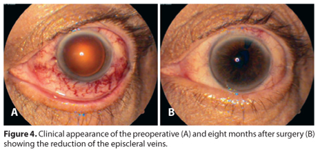 Glaucoma surgeries, such as trabeculectomy, sclerectomy and sinusotomy, performed at the appropriate time, can provide good treatment results, although they do not always result in the reduction of episcleral vessels(7). During the postoperative period, as in this case, there can be more frequent choroidal effusion than normal(8). Sinusotomy is a surgical procedure effective in treating Radius-Maumenee syndrome, and its early realization prevents damage to the optic nerve(9,10).