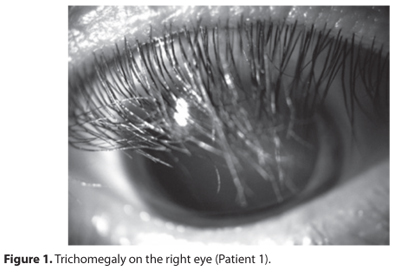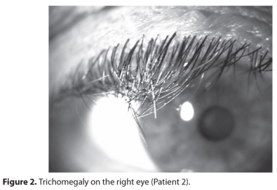 Patient 1. A 63 year-old male patient with medical history of treated prostate cancer five years ago and considered cured and with an unremarkable past ocular history. His complaint was decreased visual acuity in both eyes. The ophthalmological exam disclosed trichomegaly, as seen below (Figure 1).