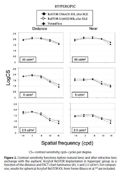 In conclusion RLE with aspheric AcrySof ReSTOR in presbyopic population provided good visual function and yield good distance and near CS under photopic and mesopic conditions in myopic and hyperopic patients. Although mesopic CS is reduced at distance and near in relation to that found under photopic conditions, the performance is comparable to that obtained prior to surgery with the natural lens and better than the results obtained in patients implanted with spherical AcrySof ReSTOR. Further studies are needed to assess the stability, photic phenomena, such as starbursts and halos, patient satisfaction, the role of pupil size after this multifocal IOL implantation and intermediate visual acuity for comparison with others IOLs profiles.