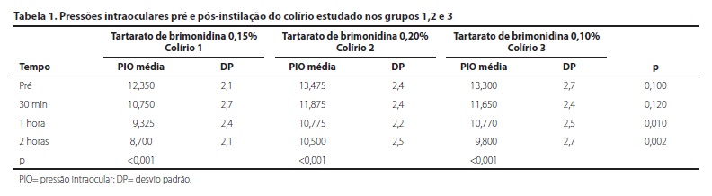 MÉTODO: Estudo prospectivo, randomizado, duplo-cego que contou com 60 voluntários, os quais foram submetidos a exame oftalmológico inicial e aferição da pressão intraocular (PIO). Os participantes foram distribuídos em três grupos: 1 tartarato de brimonidina 0,15%, 2 tartarato de brimonidina 0,2% e 3 tartarato de brimonidina 0,1%, aleatoriamente, cada um recebeu uma gota de colírio em cada olho e a pressão intraocular foi aferida após 30 minutos, 1 hora e 2 horas.