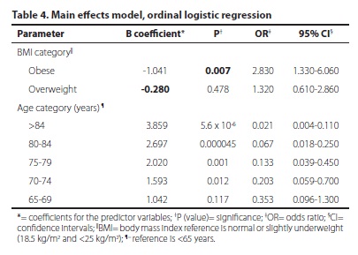 In the ordinal logistic regression main effects model, the most severe AMD indication in either eye was taken as the score (1-4) for the dependent variable. All variables were entered into a single block and those with a p value >0.05 removed. The variables age and BMI categories were retained.
