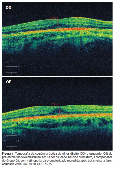 RESULTS: Twenty-four premature infants (48 eyes) presented the criteria required for the research, chronological age ranging from 5 to 6 years. At BIO, there was a statistically significant difference for the presence of alterations in the retina of premature infants from group G1. However these changes corresponded to the cicatricial lesions left by the ROP treatment, without visible impairment to the macular region. At OCT there were statistically significant differences for the greatest foveal thickness between premature infants from groups G1 and G2. Considering the left eye, there was no statistically significant difference related to the thickness of the fovea between G1 and G3. There was no difference among the three groups studied in relation to the changes of the retinal layers at OCT.