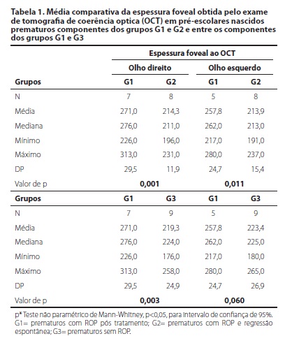 RESULTADOS: Vinte e quatro prematuros (48 olhos) apresentaram os critérios exigidos para a pesquisa, com idade média cronológica entre 5 e 6 anos. À OBI, houve diferença estatística significativa para a presença de alterações na retina dos prematuros do grupo G1. No entanto estas alterações corresponderam às lesões cicatriciais deixadas pelo tratamento da ROP, sem comprometimento visível da região macular. À OCT houve diferença estatística significativa para a maior espessura foveal para os prematuros do grupo G1. Considerando-se o olho esquerdo, não houve diferença estatística significativa relacionada à espessura da fóvea entre G1 e G3. Não houve diferença entre os três grupos estudados quanto às alterações encontradas nas camadas da retina ao OCT.