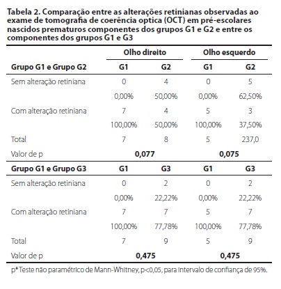 Em relação à comparação entre os grupos G1 e G2 e entre G1 e G3, referentes às alterações nas camadas da retina, os resultados estão representados na tabela 2.
