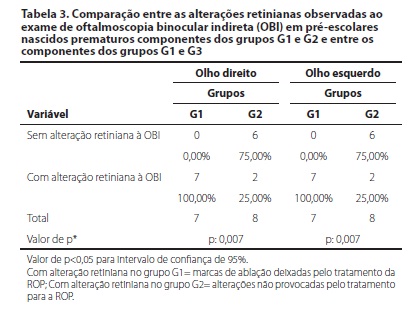 Na análise comparativa dos achados da oftalmoscopia binocular indireta entre os grupos G1 e G2, encontrou-se diferença estatisticamente significativa para o grupo G1 (p=0,007 AO, intervalo de confiança 95%). No grupo G1 este resultado expressa as alterações secundárias às sequelas deixadas pelo tratamento na fase aguda da ROP, a laser ou por crioterapia. Todos os prematuros sem ROP apresentaram à OBI, retina aplicada com aspecto anatômico normal.
