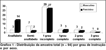 Os analfabetos, os semi-analfabetos e aqueles com primário incompleto formam o maior número de pacientes entrevistados correspondendo a 87,23% da amostra (Gráfico 1). Pesquisas realizadas na Região Metropolitana de São Paulo, indicam que esse nível inferior de escolaridade predomina entre as famílias com renda até 4 salários mínimos o que indica a coerência dos resultados da amostra deste trabalho (Pesquisa Origem - Destino (1987) - Metrô de São Paulo). Portanto estes resultados devem ser avaliados apenas como uma tendência, talvez uma amostra maior possa confirmar os valores obtidos.