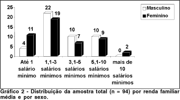 Pode-se observar que a amostra é formada basicamente de indivíduos com renda familiar mensal média inferior a 3 salário mínimos (Gráfico 2). Os valores de renda familiar apresentaram grande discrepância, o que levou a adoção do valor da mediana para efeito de cálculos (Tabela 2). Não foi encontrada correlação significativa entre renda e gastos totais e descriminados para os grupos CG e NC.