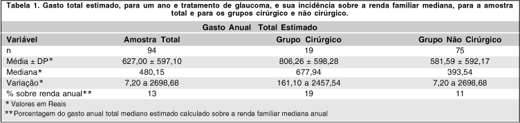 Cabe observar que os valores monetários estão em reais, na base de abril/97, época da pesquisa, não tendo sido aplicado, qualquer fator de atualização. Este fato, entretanto, não prejudica o objetivo final do trabalho em apresentar o custo relativo do tratamento de glaucoma sobre a renda familiar do paciente, que se mostrou atendido pela coerência estatística.