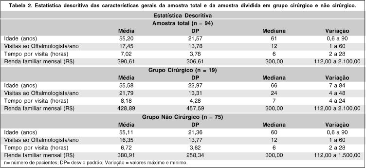 Para as análises estatísticas, a amostra foi separada em dois grupos: pacientes cirúrgicos (CG) e não cirúrgicos (NC). Os cirúrgicos, pacientes em pós-operatório de cirurgia antiglaucomatosa de no máximo um ano da data de sua entrevista, uma vez que o questionário se referia aos últimos doze meses.